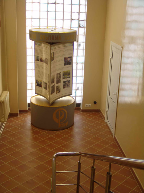 Был выполнен тюнинг основного лестничного марша, по которому гости предприятия входят в корпус. Установлены красивые поручни, сделаны навесные потолки, покрашены стены, уложена специальная плитка для лестничных маршей, смонтировано современное освещение. Не забыли обновить и содержание рекламно-информационного вращающегося стенда, рассказывающего о деятельности предприятия.